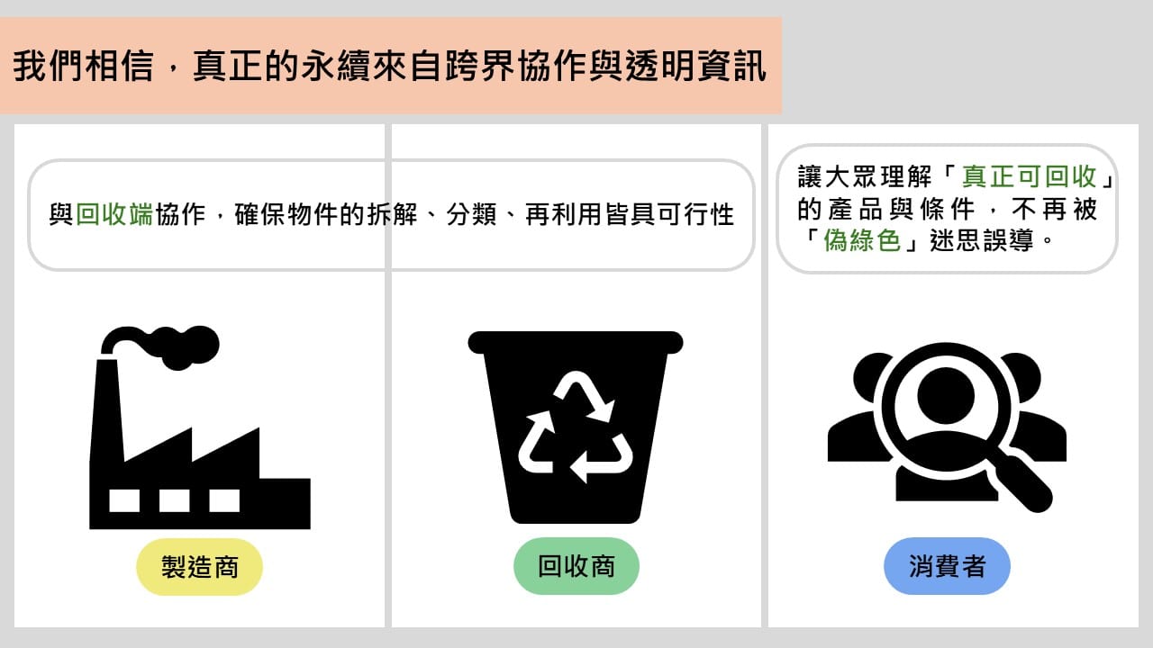 我們以此為基礎,建立一個串聯製造端、回收端與消費端的對話平台: