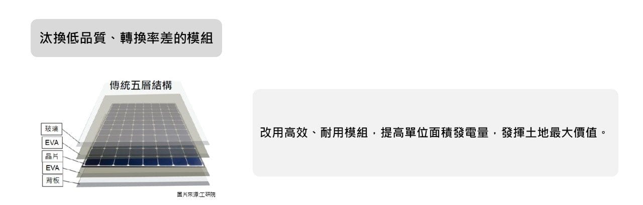 更值得注意的是,許多早期案場仍使用舊型模組,轉換效率僅約 20%,