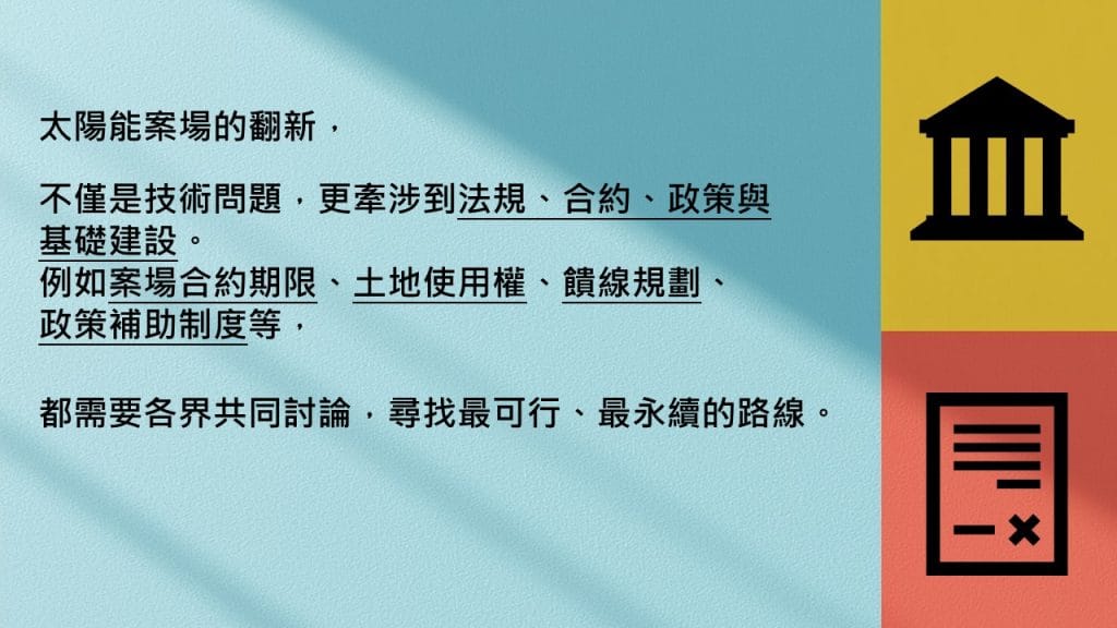 我們主張從既有基礎出發,推動「翻新太陽能」: